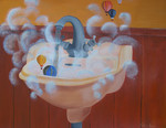 2009doos van Pandoura anders uitgebeeld. De doos is de wastafel met opstijgende ballonvaarders tussen de zeepbellen.